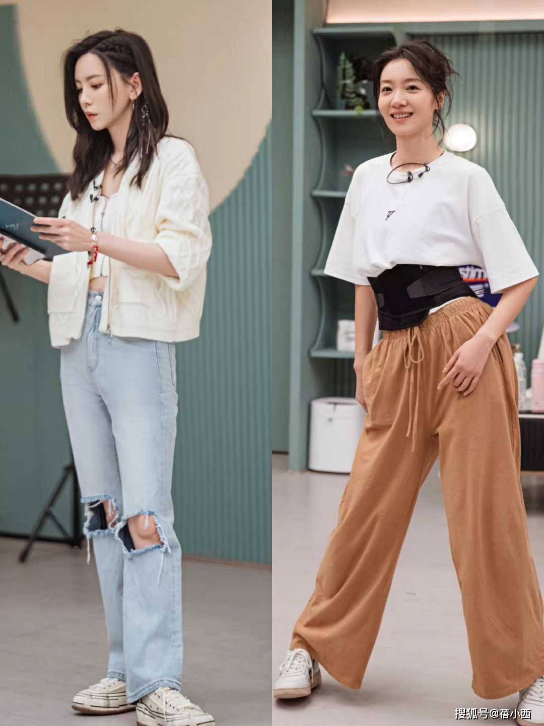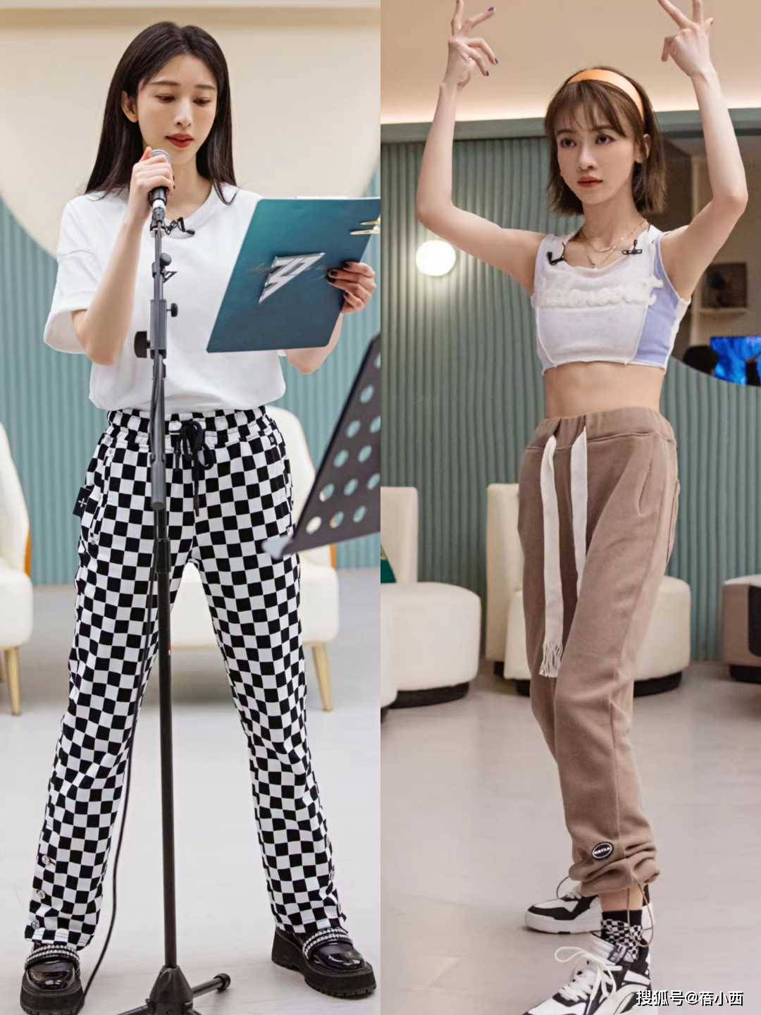 在排练时,姐姐们的穿搭更加偏向休闲风格。阔腿裤成了她们的首选,不仅穿着舒适,还显得慵懒又时尚。无论是纯色阔腿裤,还是格纹款式,都能展现出独特的时尚感。特别是黑白格纹的阔腿裤,穿起来非常洋气。阔腿裤的材质也可以多样化,从棉麻运动款到牛仔款,都非常百搭。如果想要更具潮流感,可以像于文文一样选择带有破洞设计的牛仔阔腿裤,搭配运动鞋,既舒适又不失时尚感。
