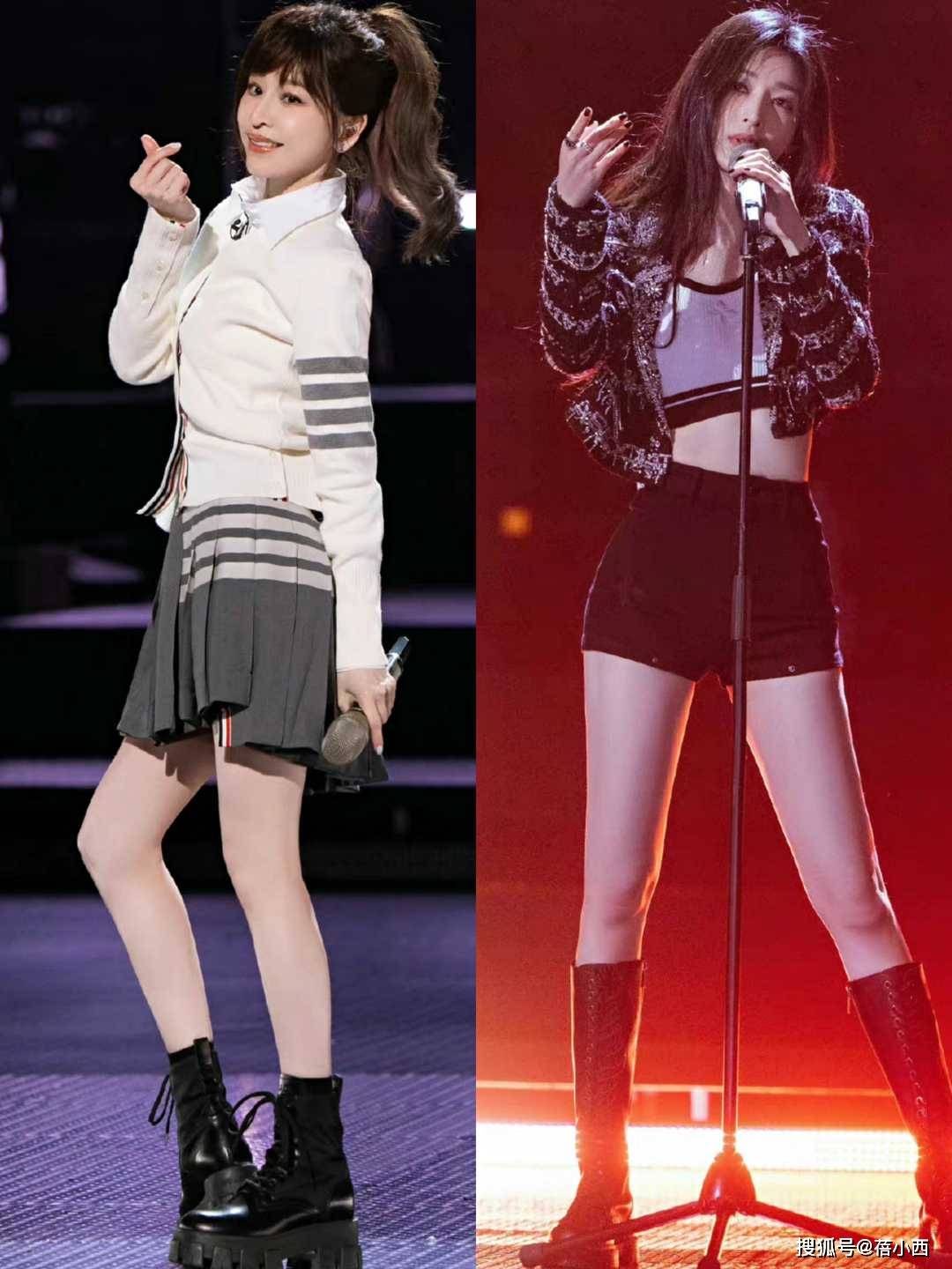 另一种备受喜爱的搭配单品是酷酷的马丁靴。在舞台上,除了高跟鞋,马丁靴也常常出现在姐姐们的鞋柜里。它们既酷又有个性,尤其适合喜欢走硬朗风格的小姐姐们。马丁靴搭配短裤或短裙,既显得腿长,又能展现出与众不同的时尚态度。例如王心凌和张俪,她们分别选择了不同长度的马丁靴,无论是短筒款还是中筒款,都能轻松打造时尚感。